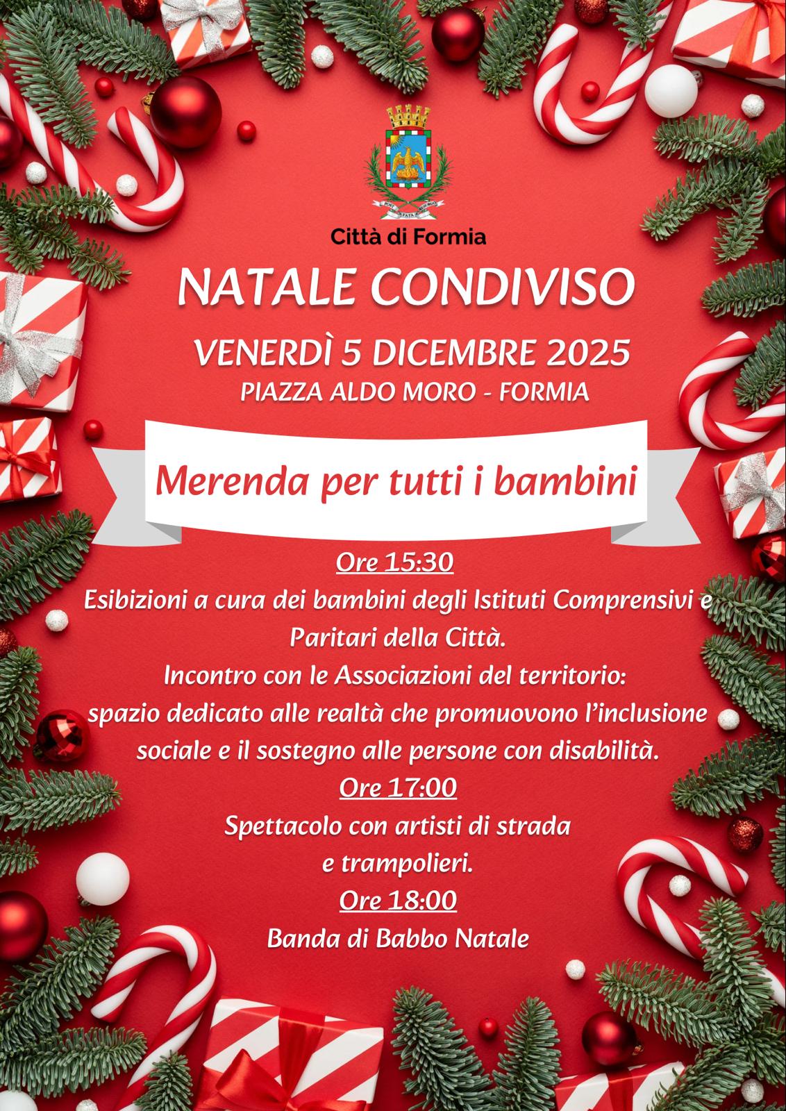 Venerdì 5 dicembre torna a Formia il “Natale Condiviso”, l’appuntamento dedicato ai bambini, alle famiglie e a tutta la comunità cittadina che darà ufficialmente il via agli eventi natalizi della città.