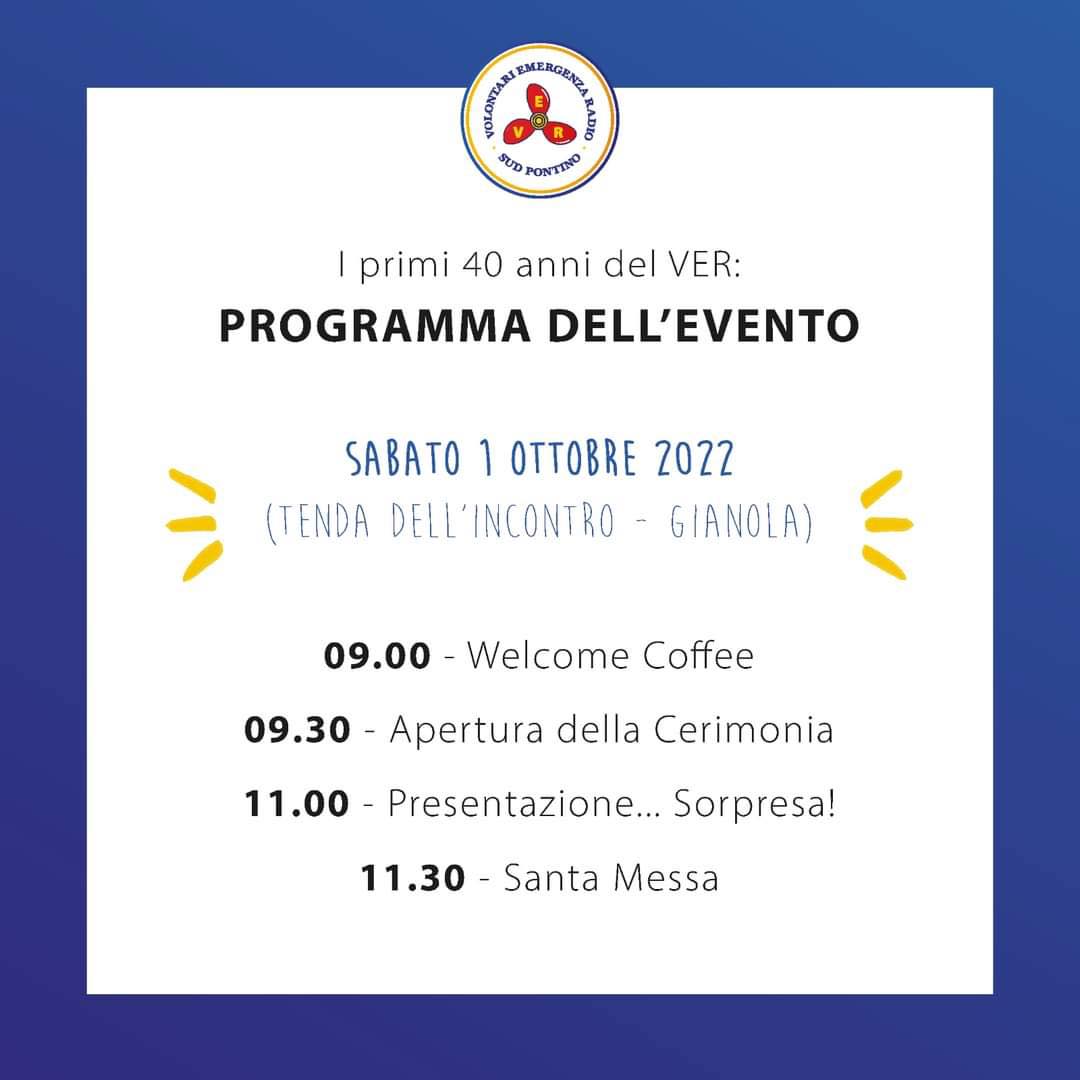 Il prossimo 1° ottobre, l’associazione Volontari Emergenza Radio - V.E.R. Sud Pontino festeggia i suoi 40 anni di attività. Grazie ai suoi 55 volontari, effettua oltre 800 servizi annui. Da 40 anni svolge attività di antincendio boschivo, protezione civile, pubblica utilità ed assistenza, nonché supporto alle istituzioni locali, regionali e nazionali per la salvaguardia del territorio.