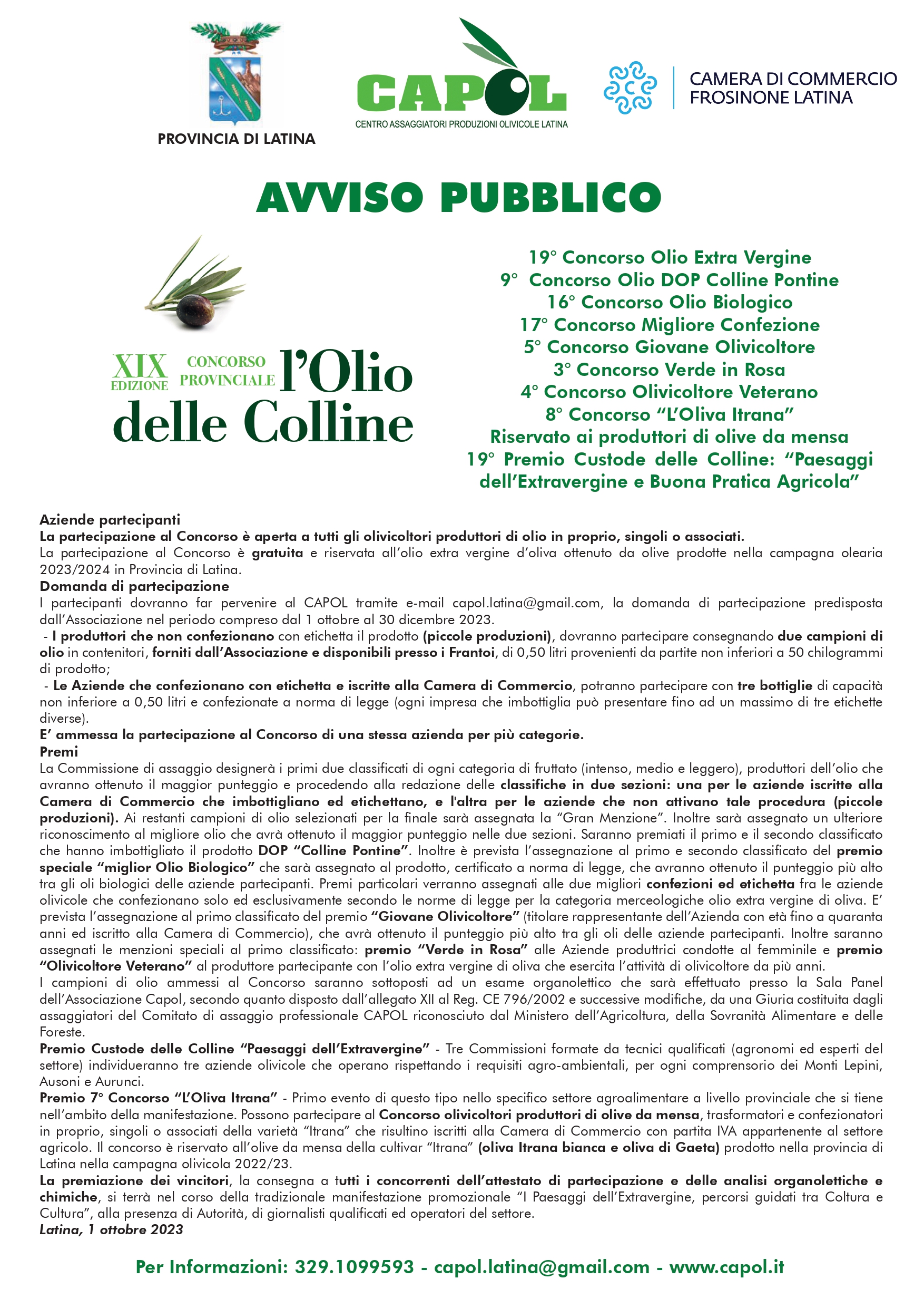 XIX Concorso Provinciale “L’Olio delle Colline, Paesaggi dell’Extravergine e Buona Pratica Agricola dei Lepini, Ausoni e Aurunci”.